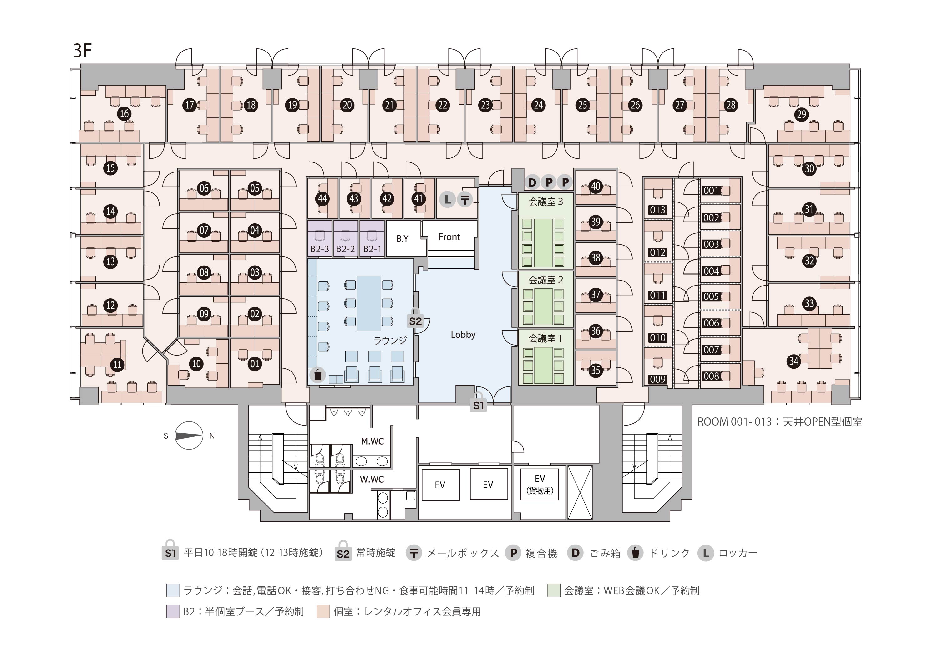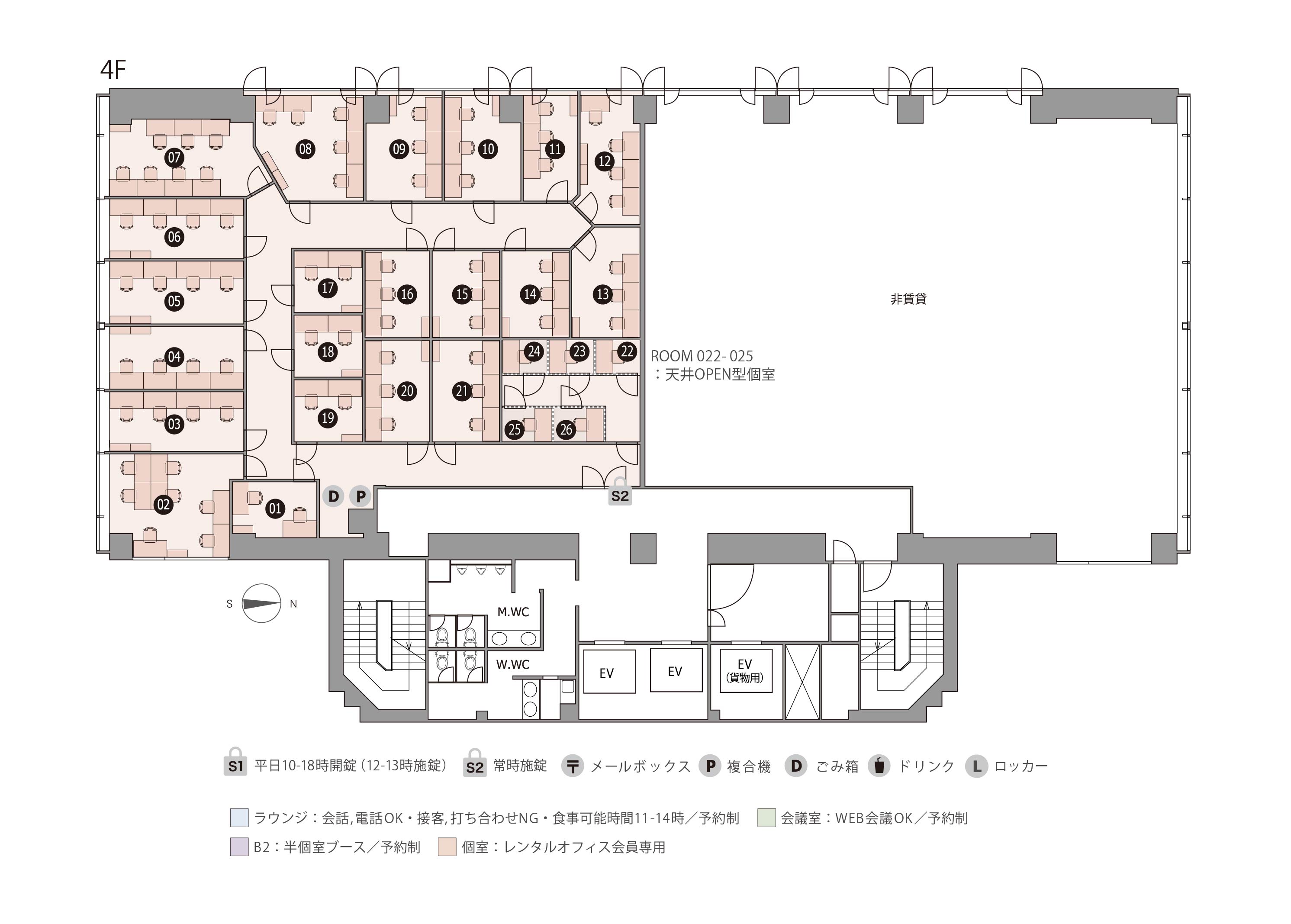 | 4F-26 | 1 | 2.34㎡ | 29,700 円 | 11,000 円 | 家具付き ブース型個室 無料ラウンジ(他拠点利用も可) 有人受付 |