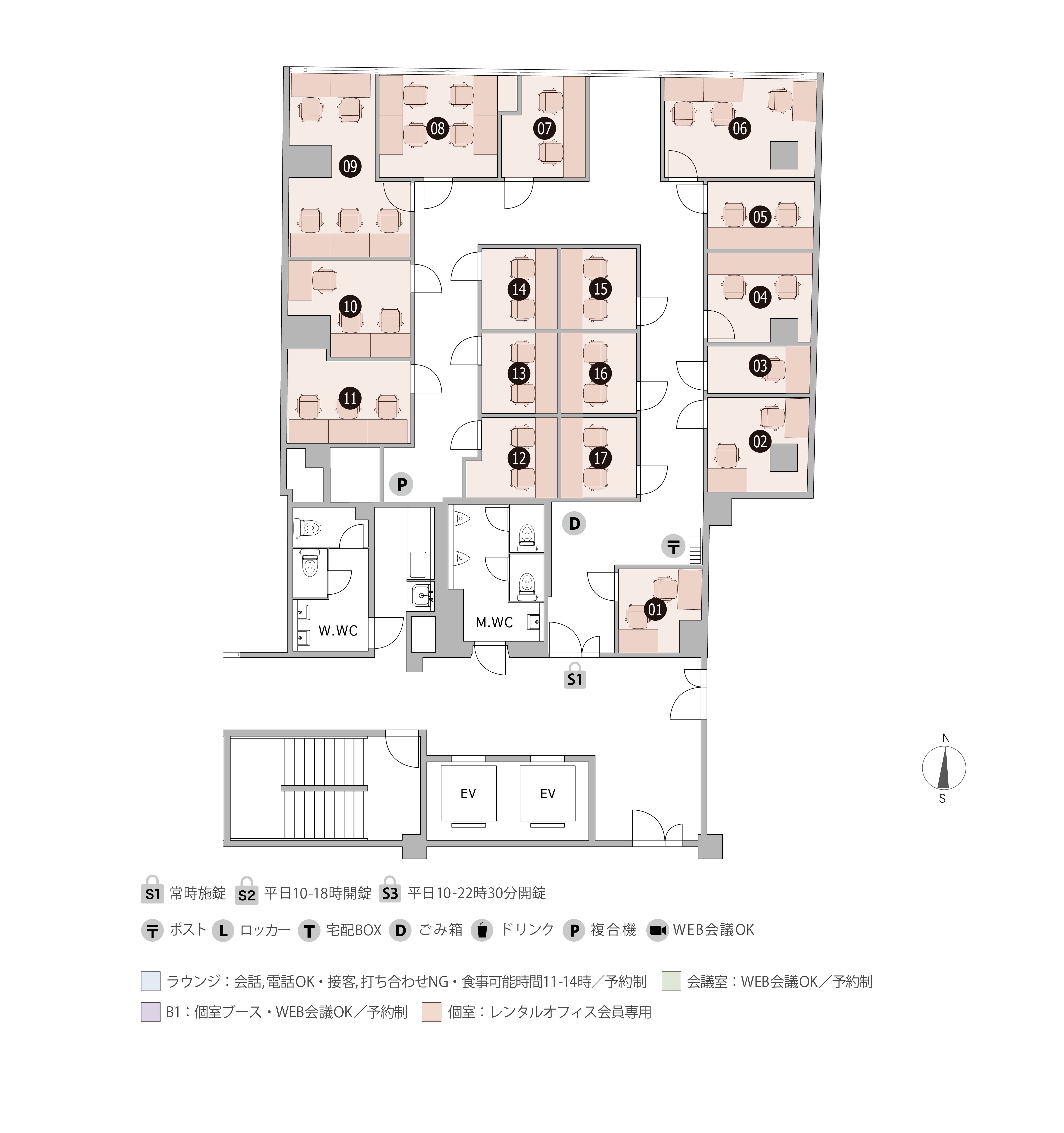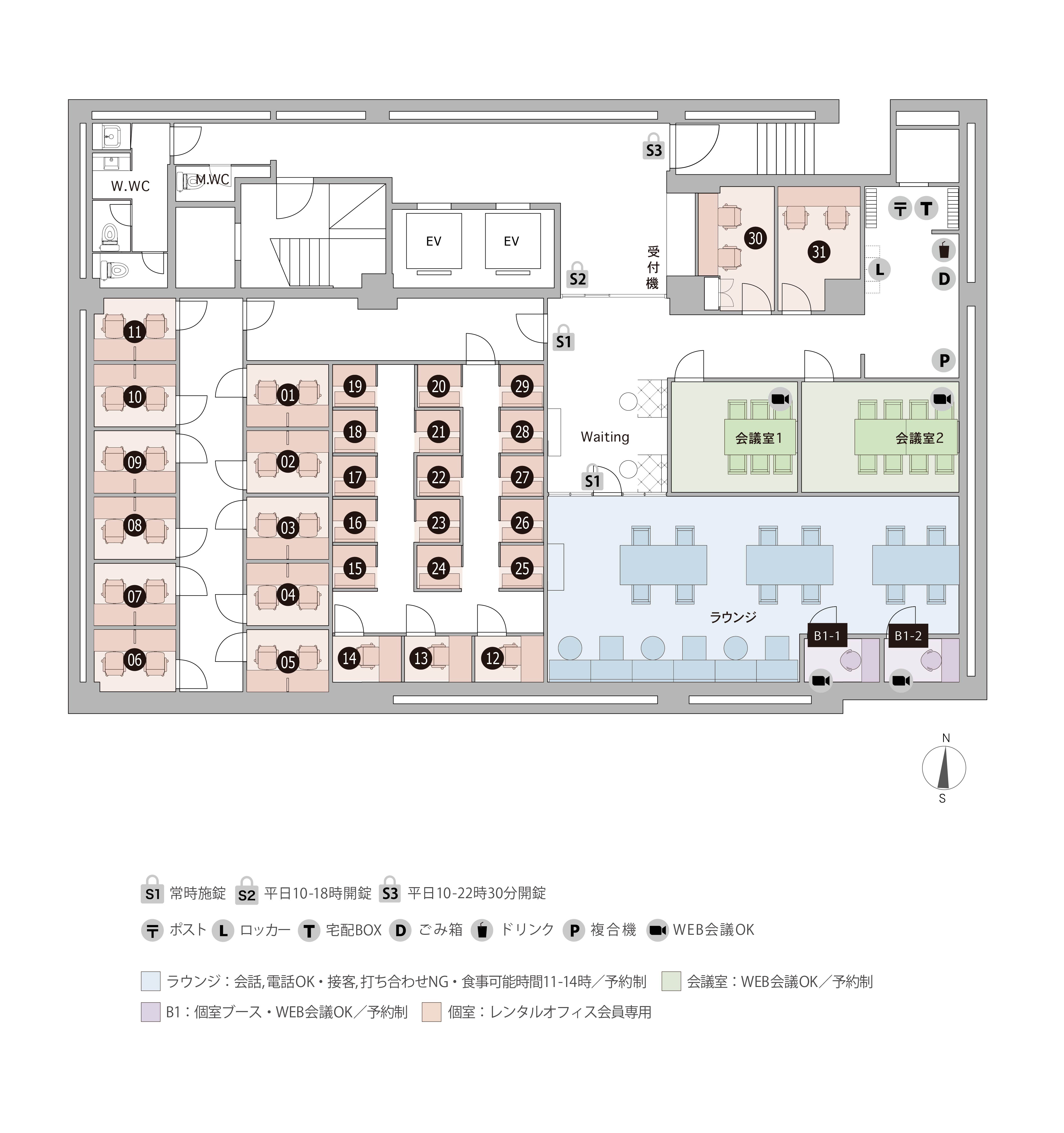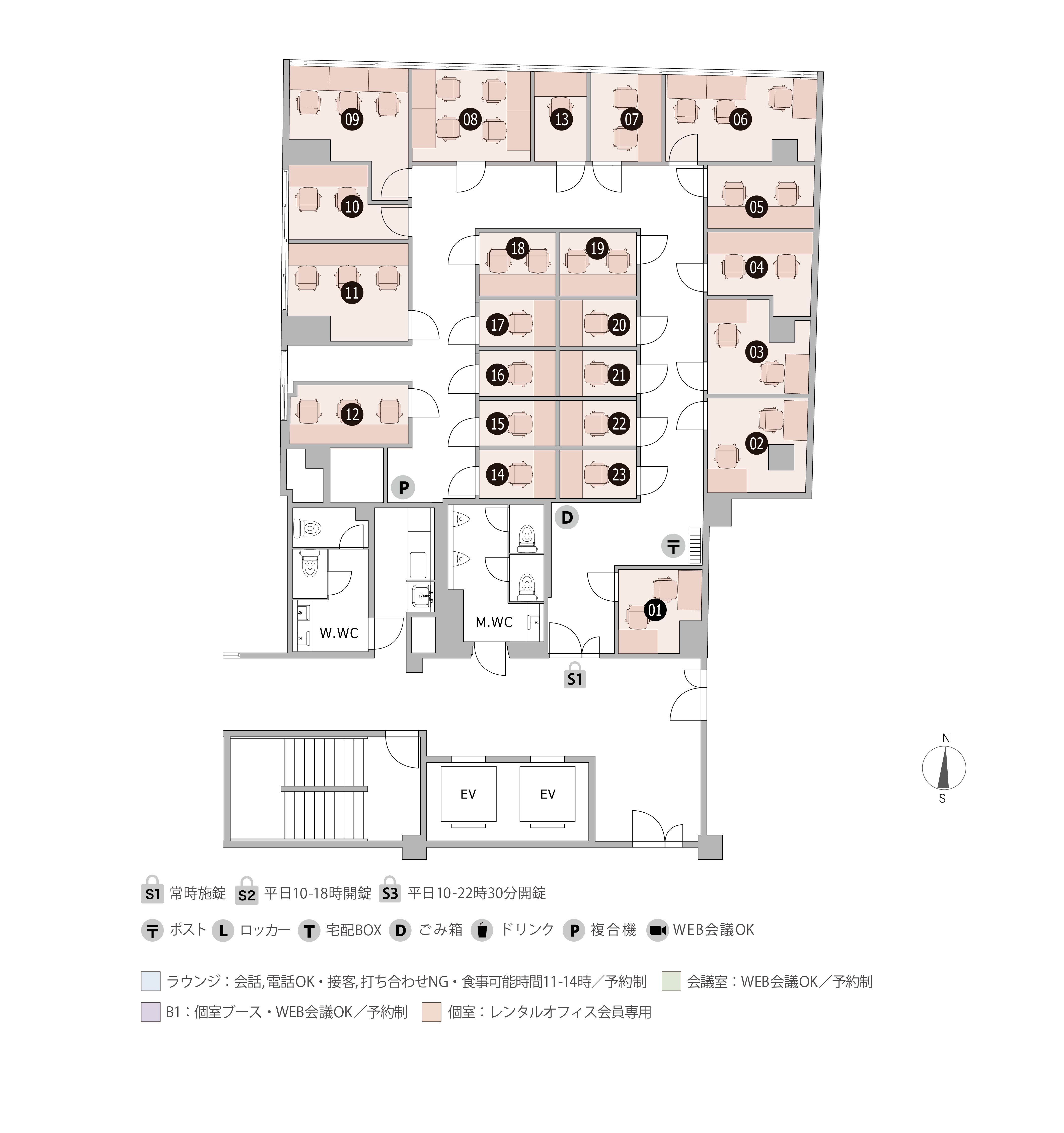 | B1-19 | 1 | 1.40㎡ | 11,000 円 | 5,500 円 | 家具付き ブース型個室 無料ラウンジ(他拠点利用も可) BOX席(専用ロッカー・専用ポストが無料)